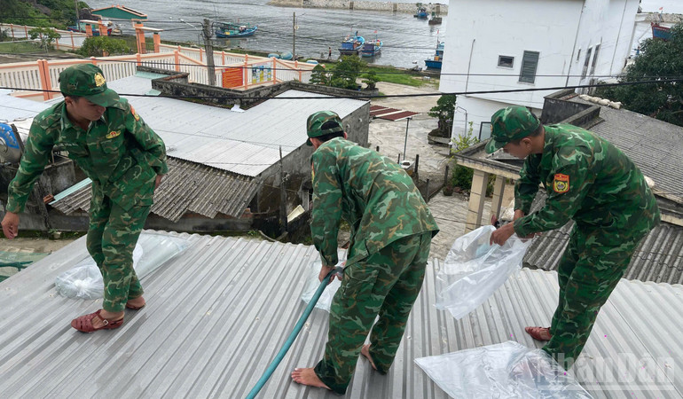 Lực lượng Bộ đội Biên phòng Quảng Ngãi hỗ trợ người dân chằng chống nhà cửa.