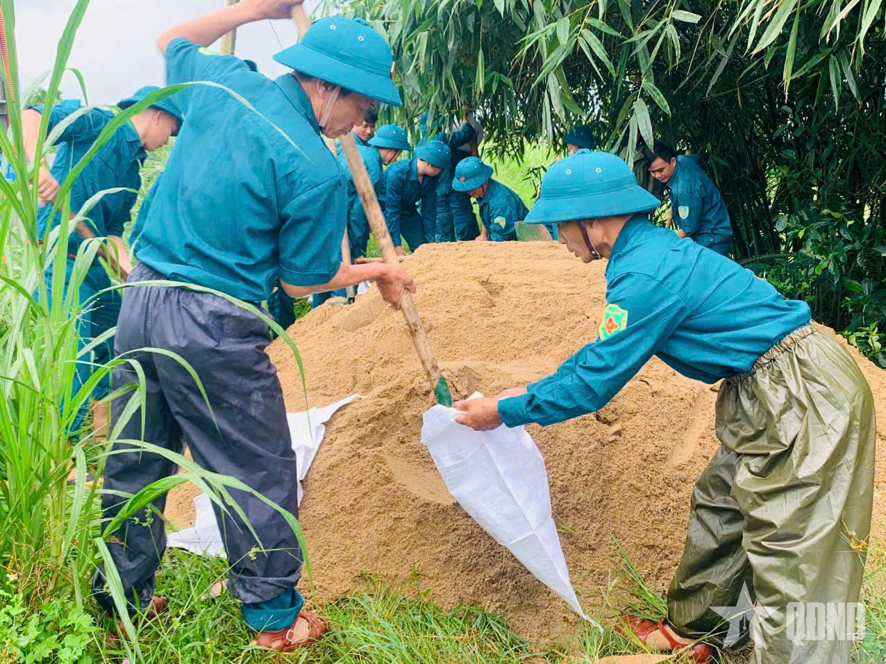 Dân quân xã Bình Sơn gia cố đên Tiên Đào, đề phòng lũ từ sông Trà Bồng tràn vào khu dân cư.