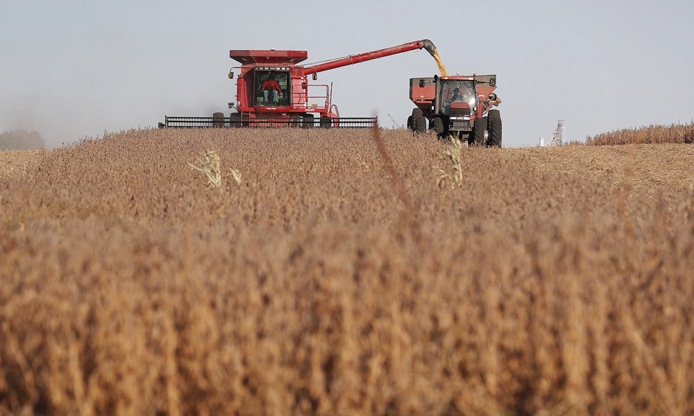 Nông dân thu hoạch đậu nành trên một cánh đồng ở Rippey, bang Iowa (Mỹ).