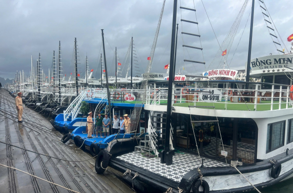 Cảnh sát đường thủy Quảng Ninh kiểm tra tình trạng neo đậu các tàu du lịch trên vịnh Hạ Long.