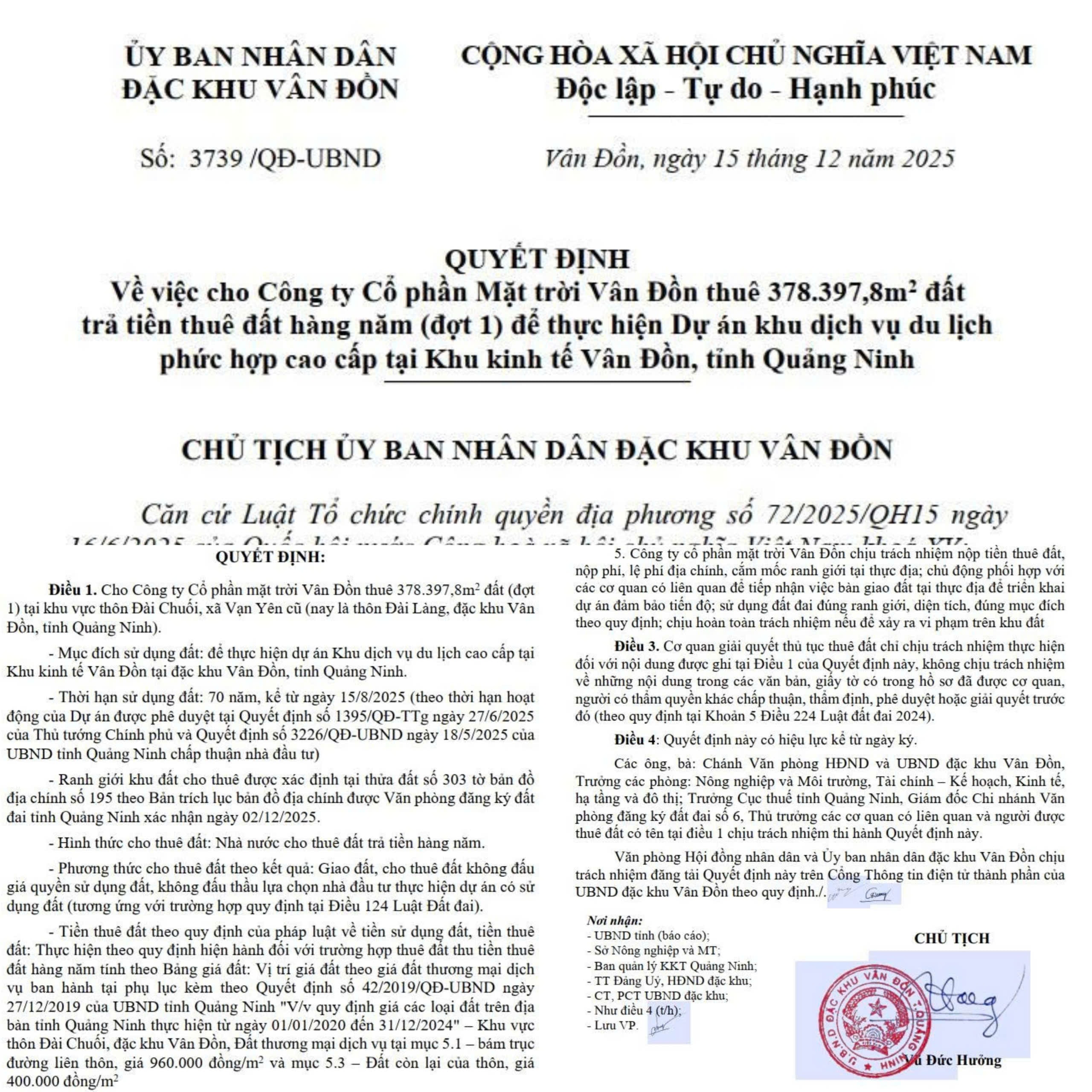 Quyết định số 3739/QĐ-UBND do ông Vũ Đức Hưởng, Chủ tịch UBND đặc khu Vân Đồn (tỉnh Quảng Ninh) ký ngày 15/12/2025 về việc cho Công ty Cổ phần Mặt trời Vân Đồn thuê 378.397,8m² đất trả tiền thuê đất hàng năm (đợt 1) để thực hiện Dự án khu dịch vụ du lịch phức hợp cao cấp tại Khu kinh tế Vân Đồn.