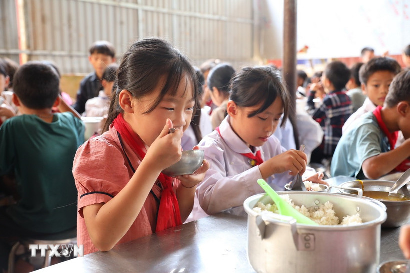 Một bữa ăn trưa của học sinh trường nội trú. (Ảnh: Phan Quân/TTXVN)
