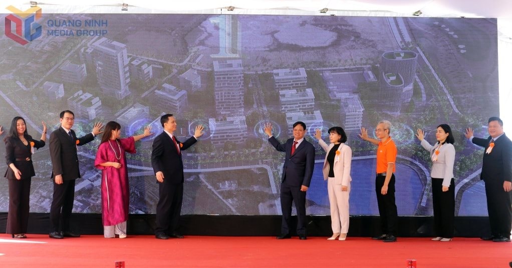 Các đại biểu thực hiện nghi thức khởi công dự án Khu công nghệ số tập trung Tuần Châu. Ảnh: Q.M.G