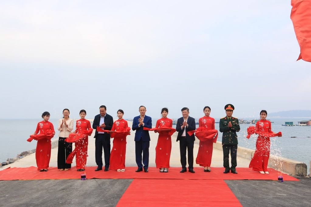 Các đại biểu cắt băng khánh thành Khu neo đậu tránh trú bão cho tàu cá đảo Cô Tô. Ảnh: Q.M.G