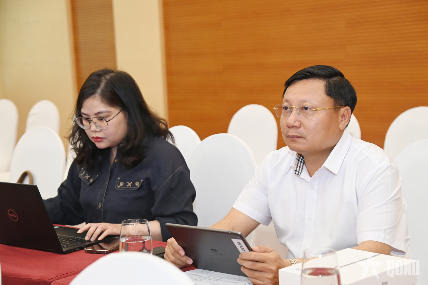 Đại tá Lê Trọng Hòa, Chỉ huy trưởng Bộ CHQS tỉnh Quảng Ninh, đại biểu Quốc hội khóa XVI (bên phải) tham dự hội nghị.