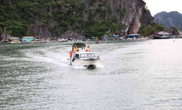 Cảnh sát đường thủy tuần tra, kiểm soát công tác phòng, chống bão trên vung biển đặc khu Vân Đồn (Quảng Ninh).
