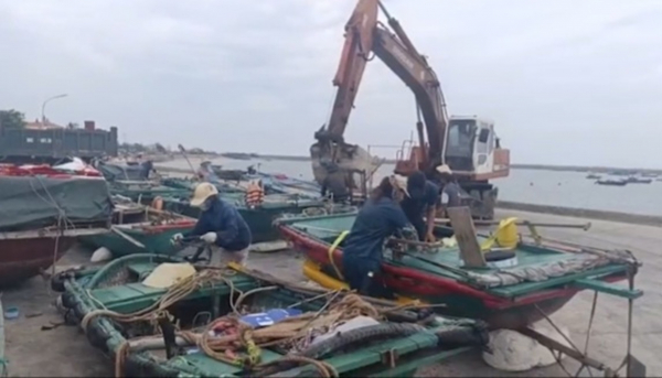 Chính quyền đặc khu Bạch Long Vỹ (Hải Phòng) dùng máy xúc cẩu phương tiện của ngư dân lên bờ tránh bão.