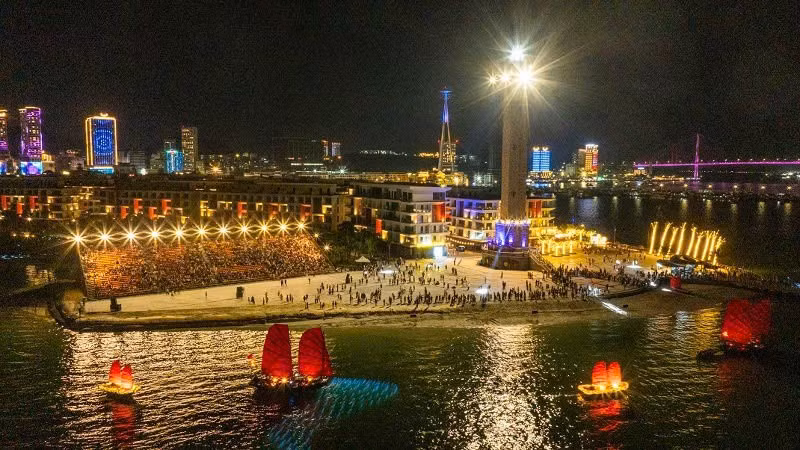 Tâm điểm của đêm khai trương là màn thủy diễn thuyền buồm - hình tượng biểu trưng của du lịch miền di sản với đội hình 6 chiếc thuyền buồm đỏ thắm chuyển động đồng bộ cùng âm nhạc và hiệu ứng ánh sáng, tạo thành hình tượng “con rồng ánh sáng” vươn mình trên mặt Vịnh Hạ Long, biểu trưng cho huyền thoại kiến tạo kỳ quan Hạ Long.
