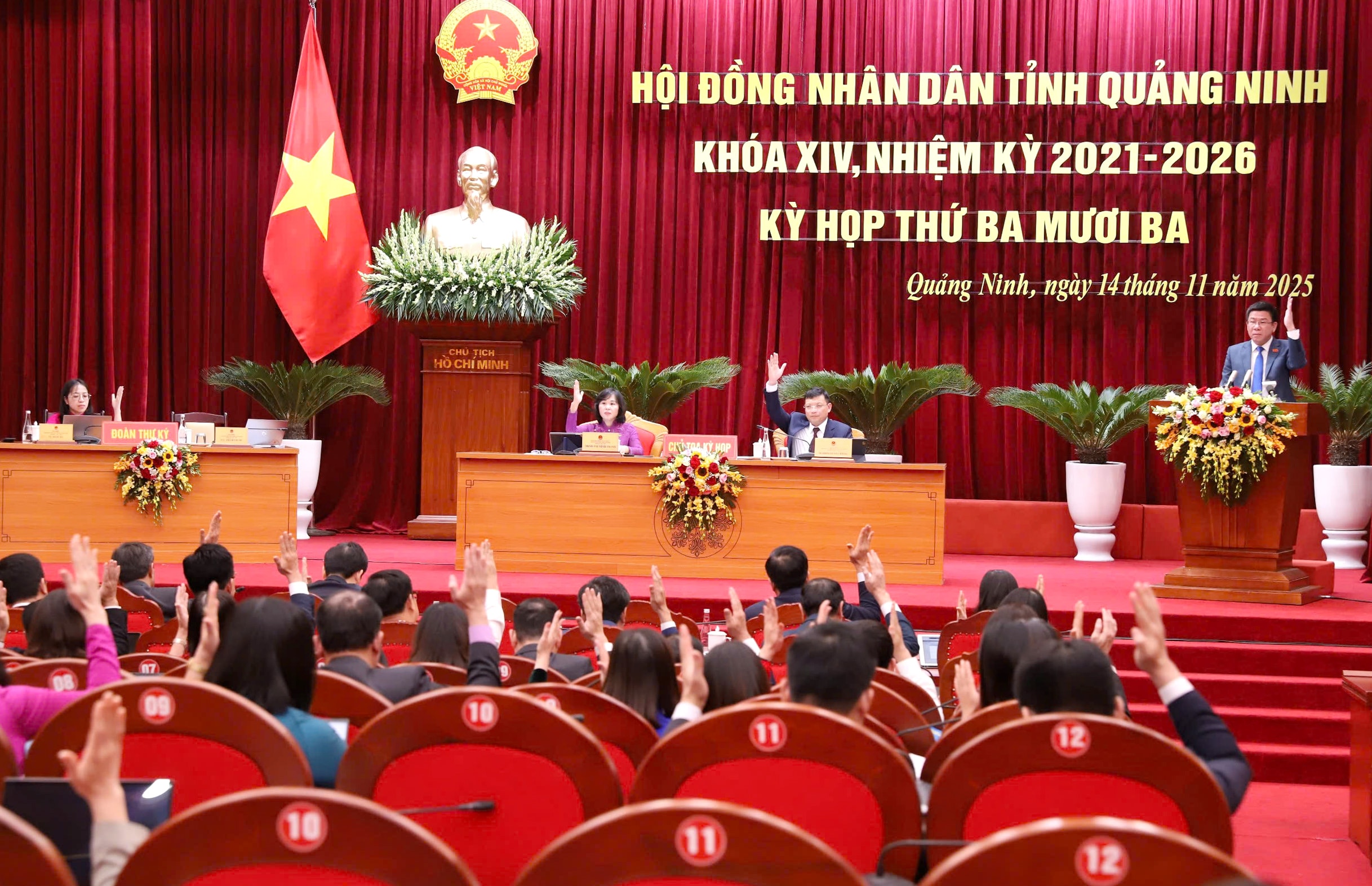 Với tinh thần nghiêm túc, trách nhiệm, HĐND tỉnh đã quyết nghị, thông qua 11 nghị quyết, bao gồm: Quy định chính sách hỗ trợ sữa uống tại trường cho trẻ mầm non, học sinh tiểu học đang học tại cơ sở giáo dục trên địa bàn tỉnh giai đoạn 2025-2030; quy định tặng quà cho các đối tượng chính sách xã hội và các đối tượng đặc thù nhân dịp Tết Nguyên đán hằng năm giai đoạn 2026-2030; quy định mức học phí đối với cơ sở giáo dục mầm non, cơ sở giáo dục phổ thông, cơ sở giáo dục thực hiện chương trình giáo dục phổ thông công lập và hỗ trợ học phí đối với trẻ em mầm non, học sinh phổ thông, người học chương trình giáo dục phổ thông trong các cơ sở giáo dục tư thục trên địa bàn tỉnh; quy định chính sách tín dụng ưu đãi thông qua Chi nhánh Ngân hàng CSXH tỉnh trên địa bàn tỉnh giai đoạn 2026-2030; quy định mức thu lệ phí đăng ký kinh doanh đối với hộ kinh doanh, HTX và liên hiệp HTX giai đoạn 2026-2030; quy định mức hỗ trợ khắc phục dịch bệnh động vật trên địa bàn tỉnh; điều chỉnh, bổ sung, phân bổ kế hoạch đầu tư công vốn ngân sách cấp tỉnh năm 2025; quy định mức chi cho hội đồng tư vấn khoa học - công nghệ, hội đồng tư vấn cấp tỉnh và lấy ý kiến tổ chức, chuyên gia tư vấn độc lập trong các dự án đầu tư trên địa bàn tỉnh Quảng Ninh; bãi bỏ Nghị quyết số 61/NQ-HĐND ngày 9/12/2021 của HĐND tỉnh về việc ban hành danh mục dịch vụ sự nghiệp công sử dụng ngân sách nhà nước trên địa bàn tỉnh; hủy bỏ danh mục các khu đất thực hiện đấu thầu lựa chọn nhà đầu tư thực hiện dự án nhà ở xã hội trên địa bàn; quyết định chủ trương chuyển đổi mục đích sử dụng rừng sang mục đích khác đợt 7 năm 2025.