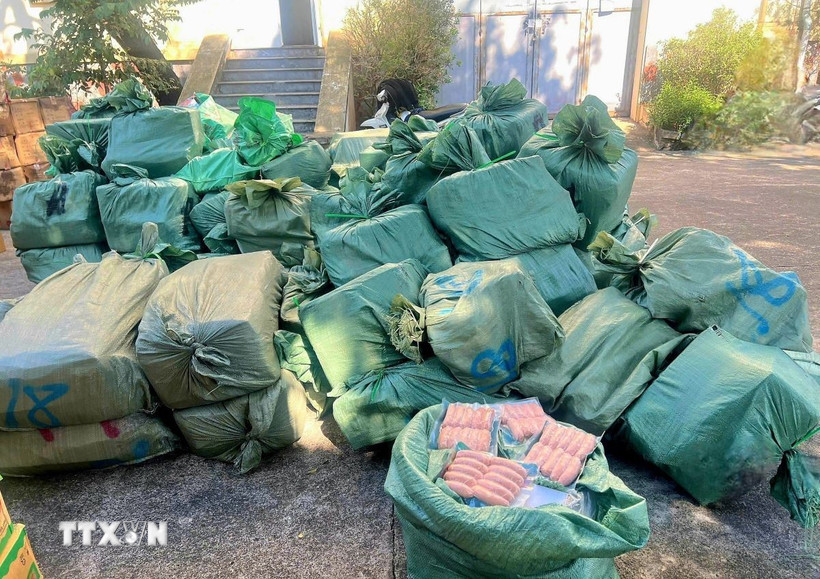 Tại hiện trường, lực lượng chức năng phát hiện và thu giữ tổng cộng 3.790kg thực phẩm các loại (xúc xích, tôm hùm, há cảo.) (Ảnh: TTXVN phát)