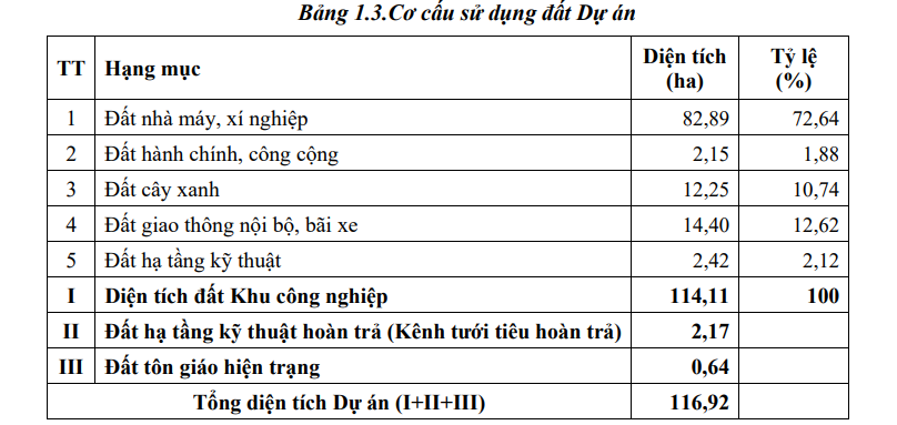 Dự án có tổng diện tích 116,92 ha, trong đó 114,75 ha là đất khu công nghiệp, còn lại là đất hạ tầng kỹ thuật hoàn trả.