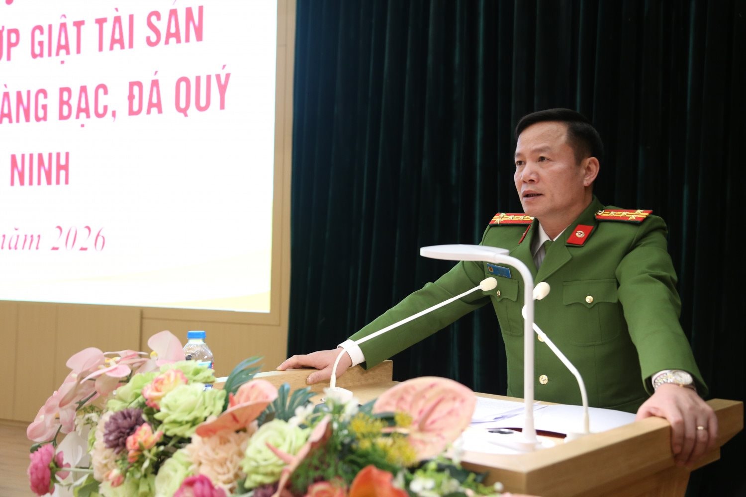 Lãnh đạo Phòng Cảnh sát hình sự thông tin về phương thức, thủ đoạn của tội phạm cướp, cướp giật tại ngân hàng, cơ sở kinh doanh vàng bạc, đá quý.