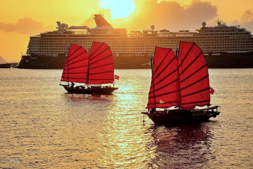 Hình ảnh thuyền ba vách với cánh buồm đỏ thắm bên cạnh những du thuyền hiện đại sang trọng bên bờ vịnh Hạ Long