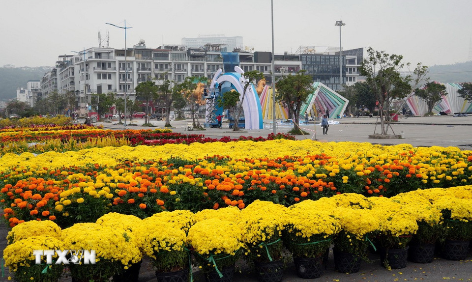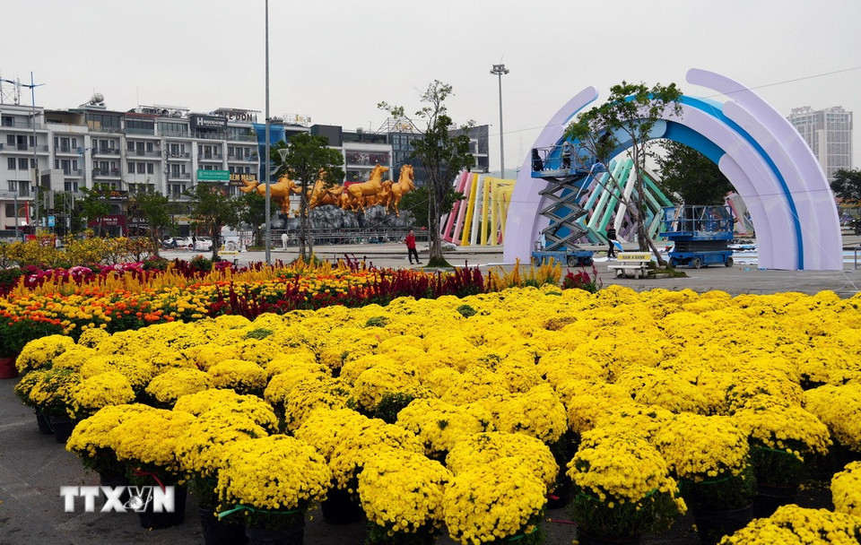 Công tác chuẩn bị trưng bày hoa. (Ảnh: Văn Đức/TTXVN)