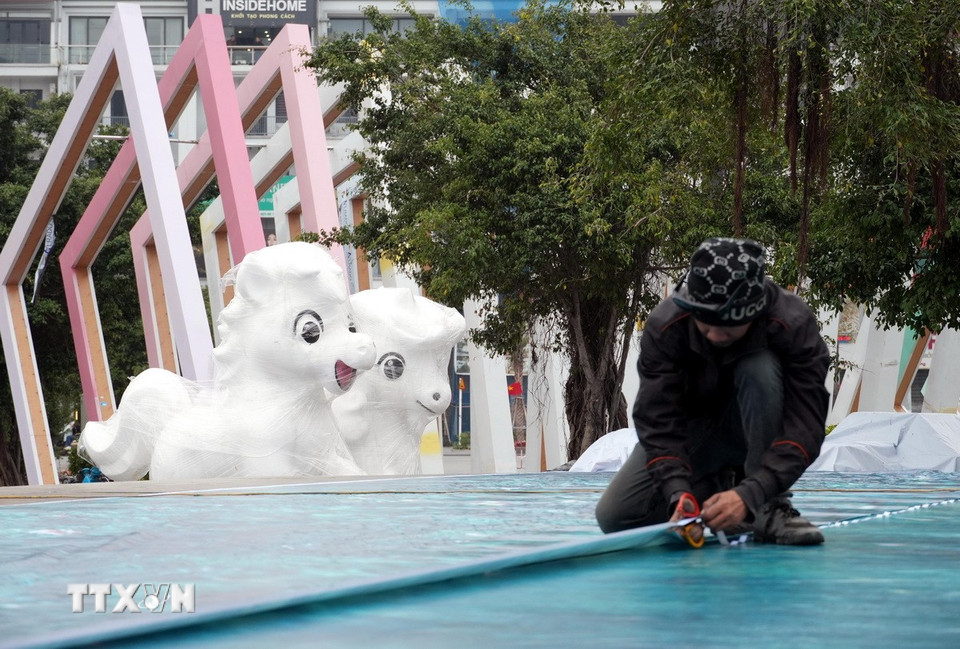 Công tác chuẩn bị trang trí các linh vật. (Ảnh: Văn Đức/TTXVN)
