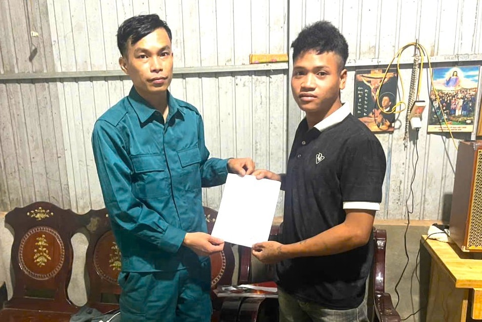 Cán bộ Ban Chỉ huy Quân sự xã Quảng Sơn đến nhà trao Lệnh gọi nhập ngũ cho công dân đủ điều kiện thực hiện nghĩa vụ quân sự