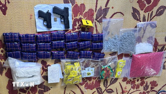 Lực lượng chức năng thu giữ được khoảng 14kg ma túy các loại. Ngoài ra, lực lượng chức năng còn thu giữ 2 khẩu súng quân dụng, 3 viên đạn, 2 cân tiểu ly, 1 máy dập, đóng gói bao bì.