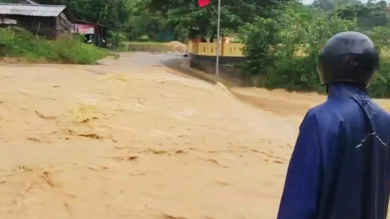 Một tuyến đường trên địa bàn xã Kim Ngân, tỉnh Quảng Trị bị ngập sâu, lực lượng chức năng của xã trực đề phòng tình huống nguy hiểm