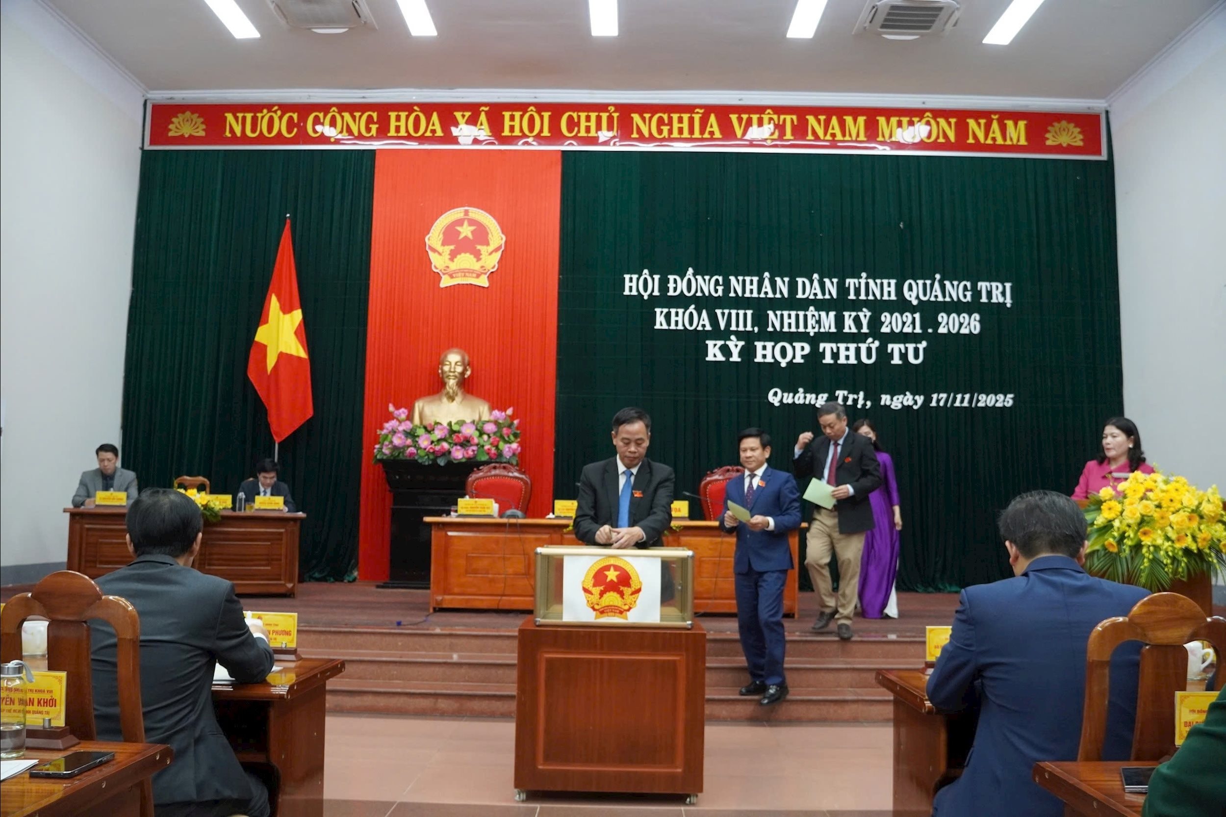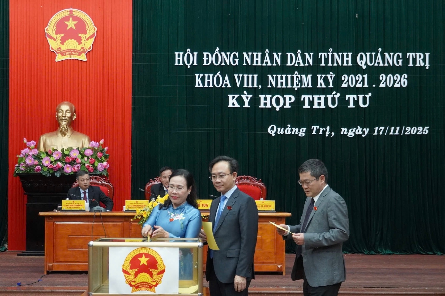 Tiếp đó, HĐND tỉnh Quảng Trị đã thực hiện quy trình bỏ phiếu bầu chức danh Chủ tịch UBND và Phó Chủ tịch UBND tỉnh nhiệm kỳ 2021 - 2026. Với 100% đại biểu có mặt tán thành, HĐND tỉnh Quảng Trị đã thông qua Nghị quyết bầu Phó Bí thư Tỉnh ủy Lê Hồng Vinh giữ chức vụ Chủ tịch UBND tỉnh Quảng Trị, nhiệm kỳ 2021 - 2026; bầu Chánh Văn phòng Tỉnh ủy Lê Văn Bảo giữ chức vụ Phó Chủ tịch UBND tỉnh Quảng Trị, nhiệm kỳ 2021 - 2026.