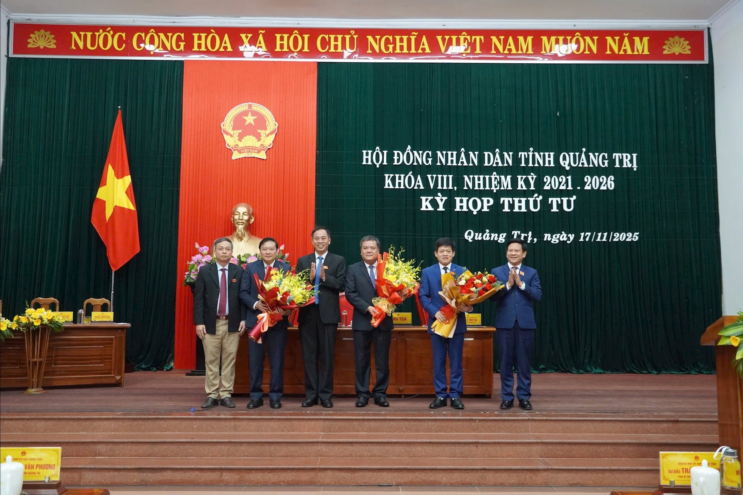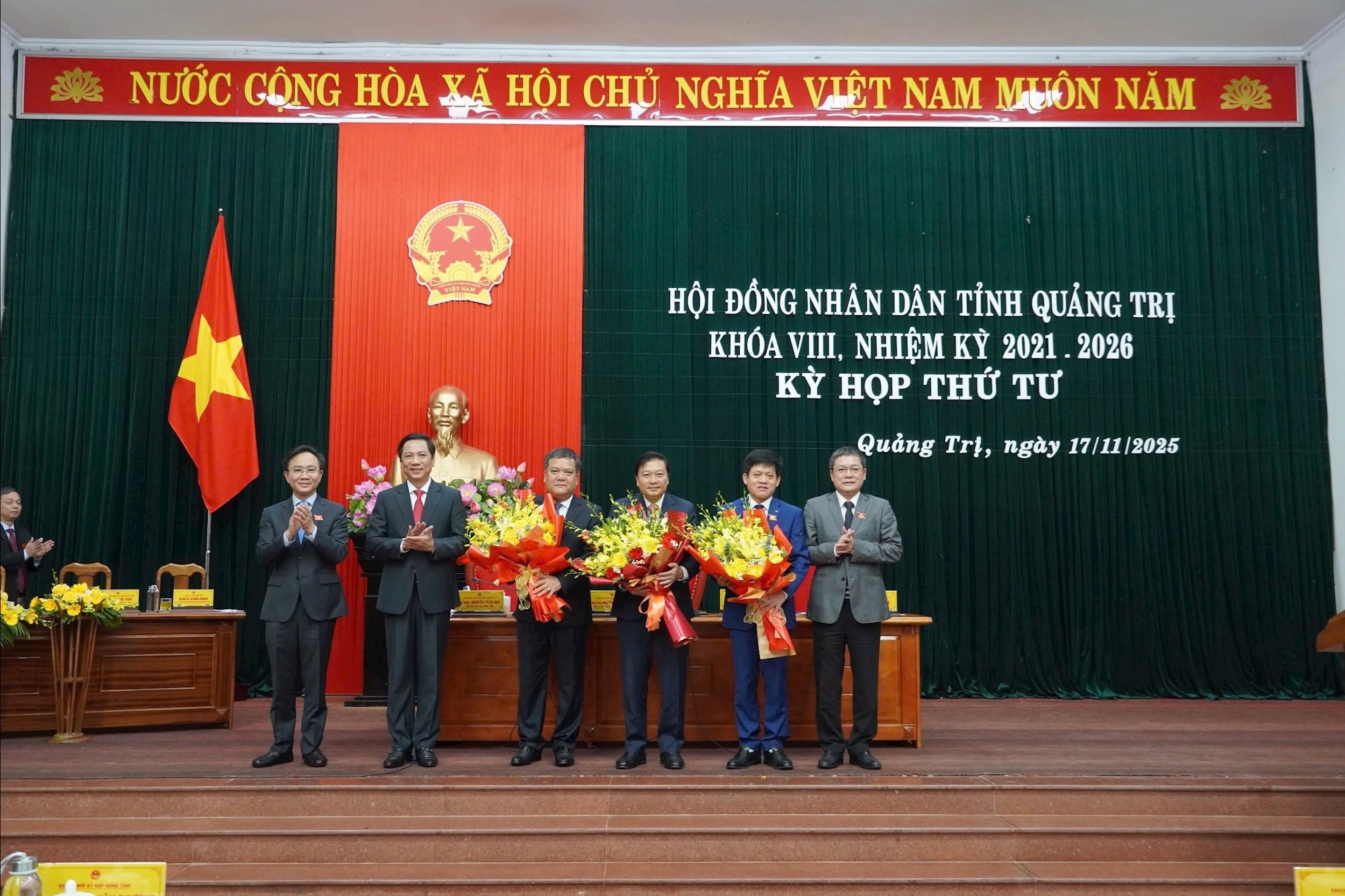 Lãnh đạo HĐND tỉnh Quảng Trị tặng hoa chúc mừng các đồng chí mới được bầu giữ các chức danh lãnh đạo.
