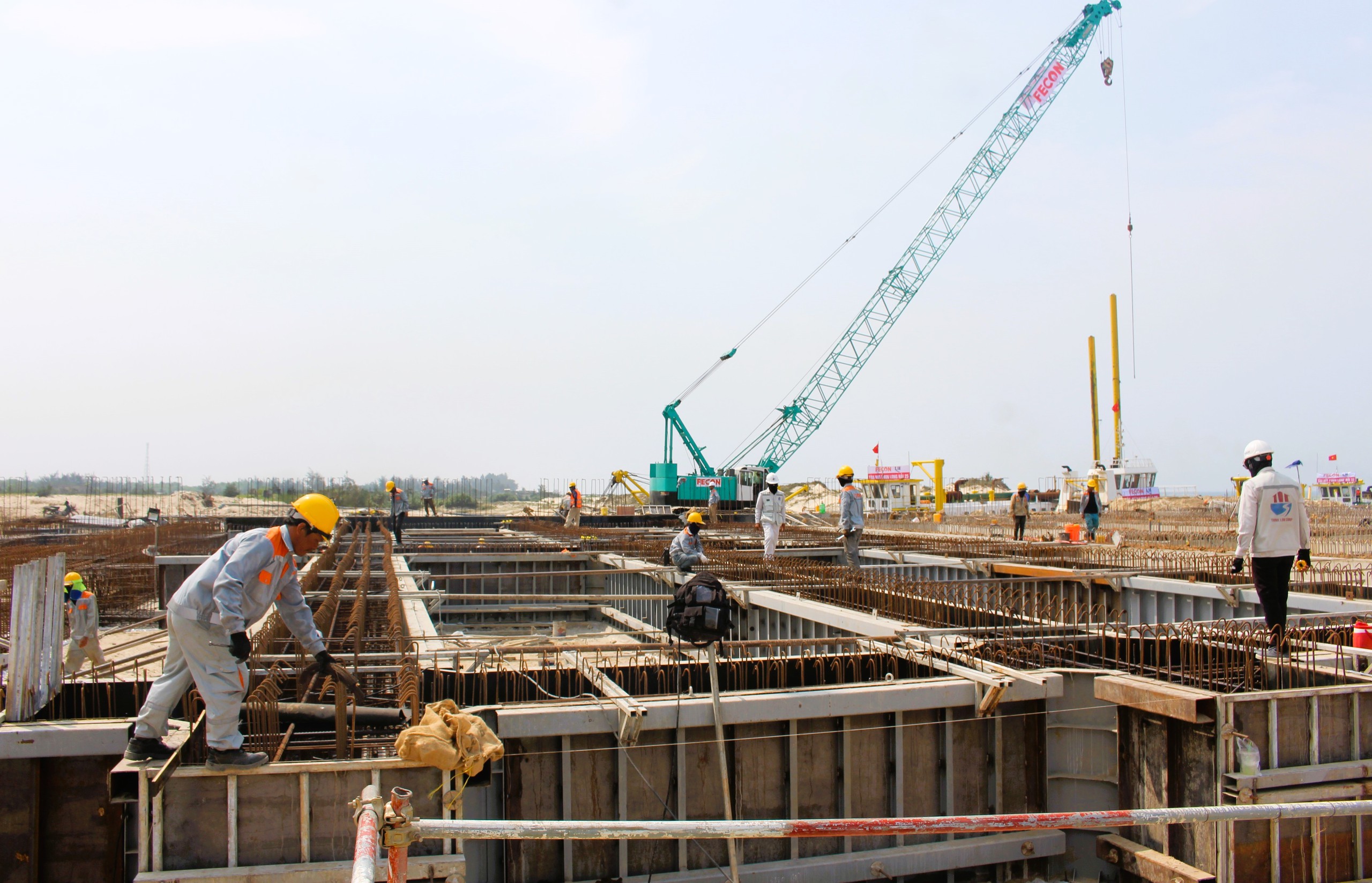 Một góc dự án Khu bến cảng Mỹ Thủy tại Quảng Trị đang thi công tháng 4/2025.