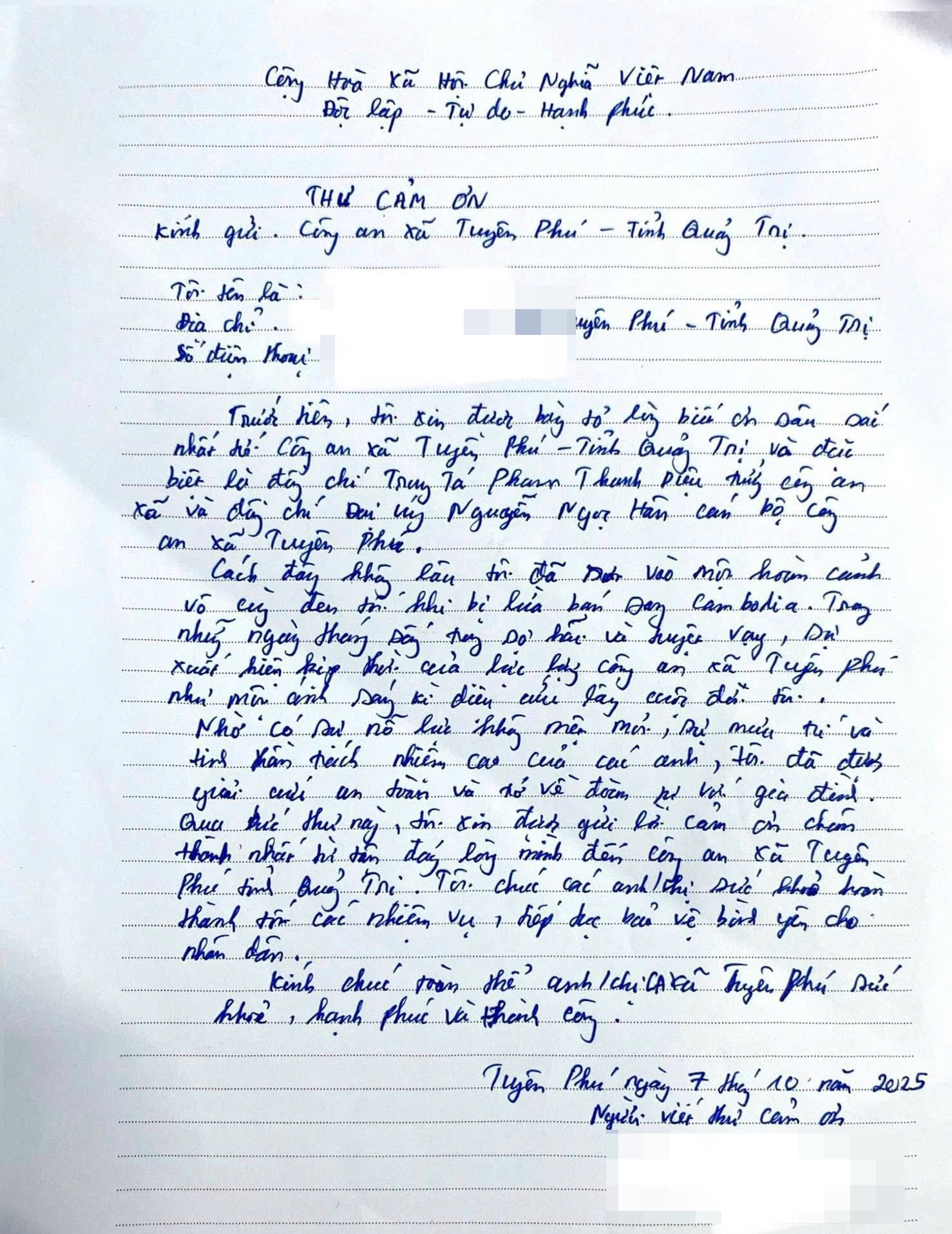 Cảm phục trước tinh thần trách nhiệm của lực lượng công an, chị V. đã viết thư bày tỏ lòng biết ơn sâu sắc đến Công an xã Tuyên Phú. Đơn vị cũng cảnh báo người dân cần cảnh giác và có biện pháp tự bảo vệ bản thân khi đi ra nước ngoài.