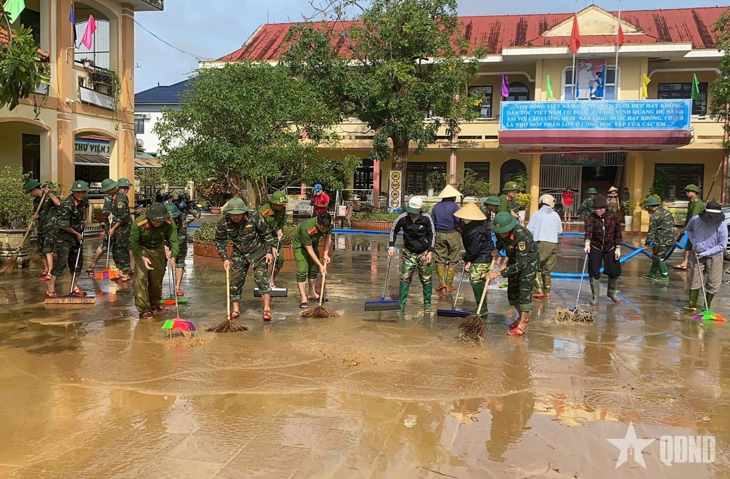 Sau 3 ngày triển khai thực hiện nhiệm vụ, cán bộ, chiến sĩ các đơn vị đã phối hợp cùng lực lượng công an, dân quân, đoàn viên thanh niên, cán bộ, giáo viên trên địa bàn xã Lệ Thủy (tỉnh Quảng Trị) tổ chức vệ sinh, thu dọn bùn đất, rác thải, làm sạch khuôn viên, sắp đặt bàn ghế, dụng cụ học tập tại các trường học, như: Trường Tiểu học số 1 Kiến Giang, Trường Tiểu học số 2 An Thủy, Trường Mầm non Hoa Mai, Trường Tiểu học Phong Thủy, Trường Mầm non An Thủy…