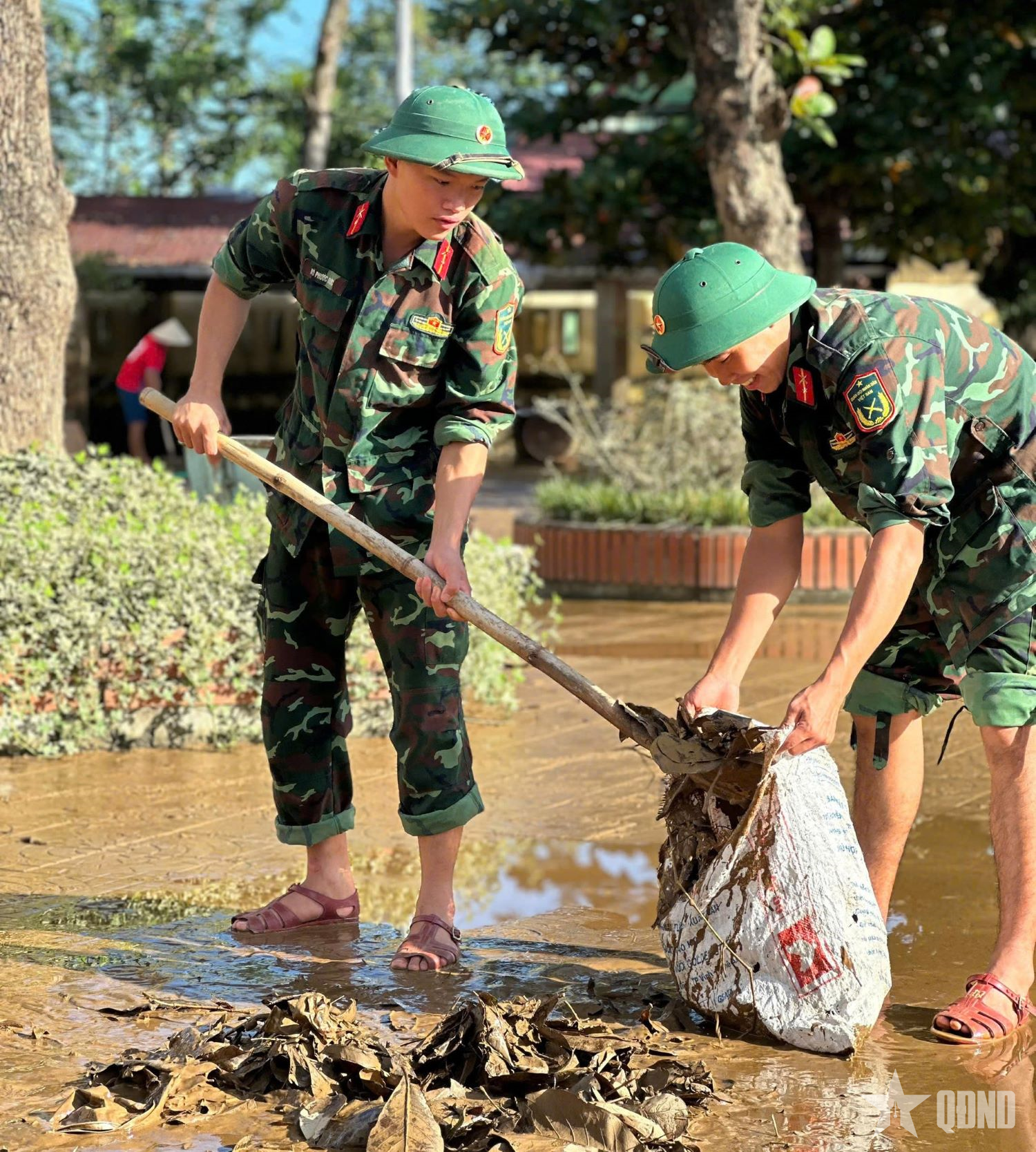 Cán bộ, chiến sĩ Trung đoàn bộ binh 996 tham gia khắc phục thiệt hại do mưa lũ tại Trường Tiểu học số 2 An Thủy.