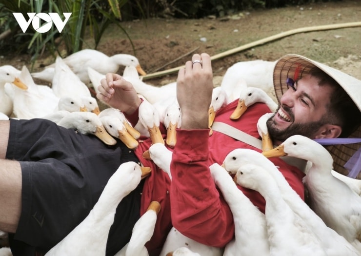 Bên cạnh đó, hoạt động chăn vịt và cưỡi trâu giữa không gian cánh đồng cũng mang lại sự phấn khích lớn cho khách nước ngoài. Hình ảnh những vị khách quốc tế thong dong cưỡi trâu hay chụp ảnh bên vật nuôi đã trở nên quen thuộc tại đây.