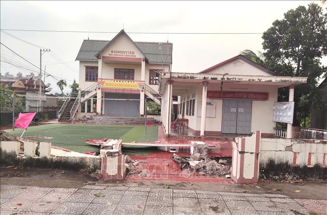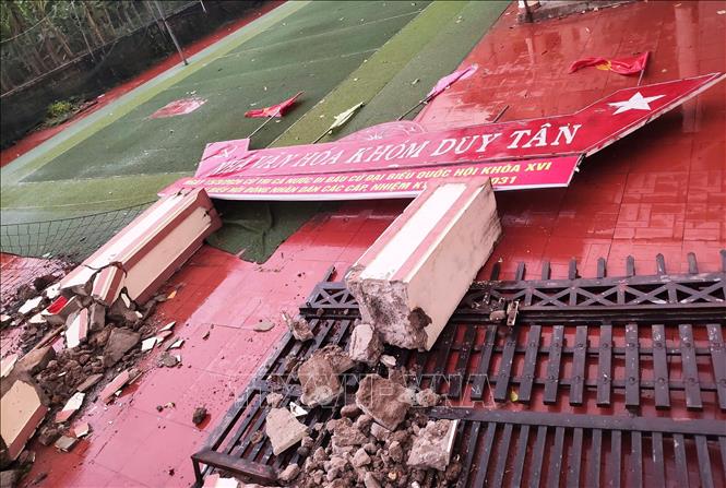 Lốc xoáy khiến cổng nhà văn hóa thôn Duy Tân, xã Lao Bảo (tỉnh Quảng Trị) bị sập và hư hỏng nặng. Ảnh: TTXVN phát