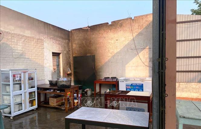 Cổng nhà văn hóa thôn Duy Tân, xã Lao Bảo (tỉnh Quảng Trị) bị sập và hư hỏng nặng sau trận lốc xoáy. Ảnh: TTXVN phát