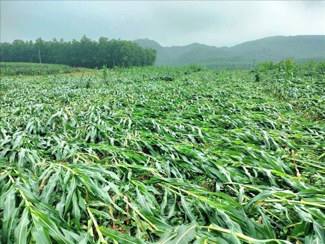 Một diện tích ngô bị gãy đổ do lốc xoáy ở Quảng Trị chiều 1/3/2026. Ảnh: TTXVN phát