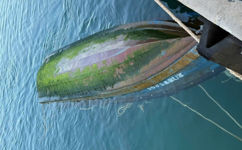 Chiếc thuyền bị lật, trôi dạt vùng biển đặc khu Cồn Cỏ. (Nguồn: Biên phòng Cồn Cỏ)