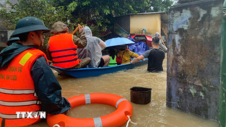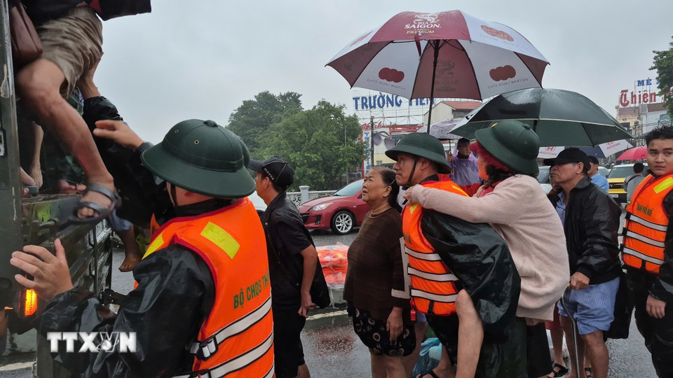 Lực lượng vũ trang Huế hỗ trợ di dời dân, tài sản khỏi khu vực nguy hiểm. (Ảnh: TTXVN phát)