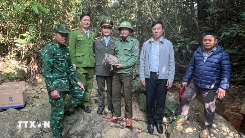 Các lực lượng chức năng thả cá thể rùa núi viền về môi trường tự nhiên. (Ảnh: TTXVN phát)