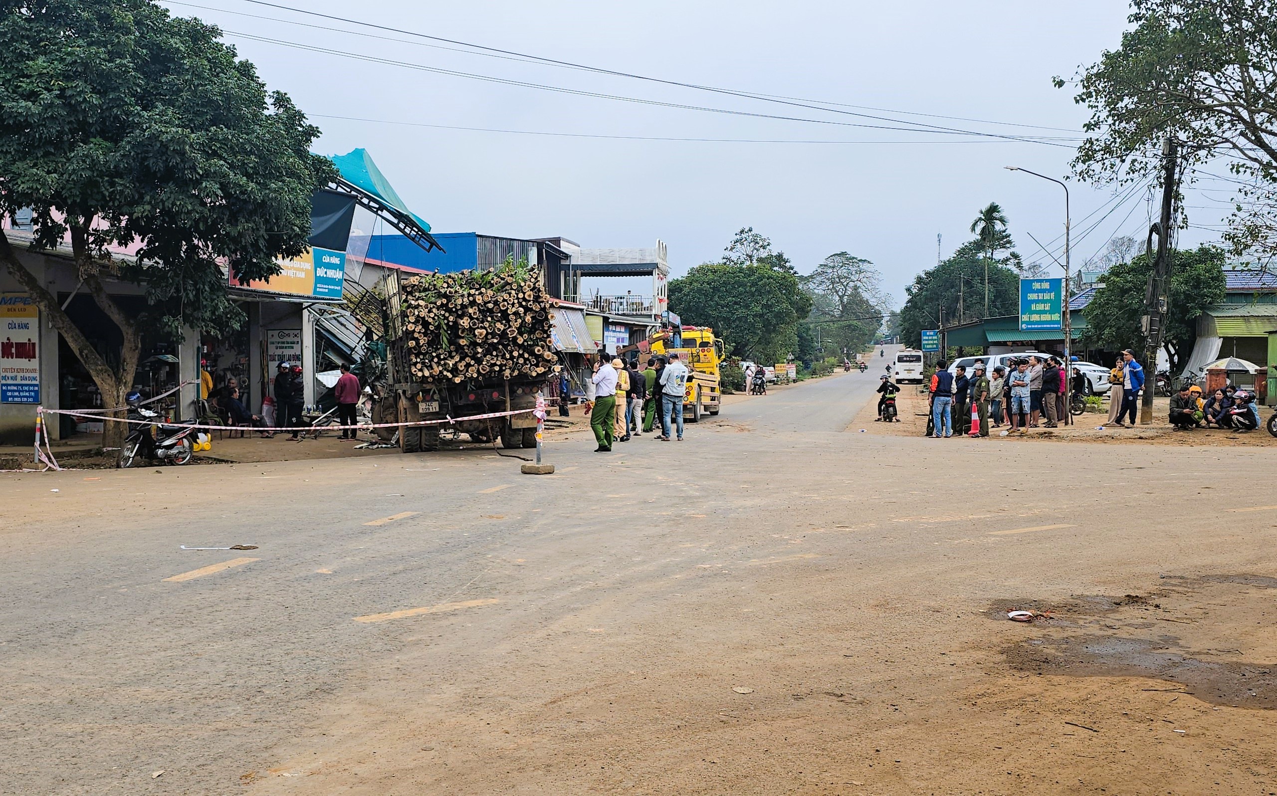 Sau va chạm với xe máy, ô tô tải tiếp tục lao vào tông sập phần hàng quán kinh doanh trước ngôi nhà hai tầng bên tỉnh lộ 576 đoạn gần đối diện chợ Gio An.