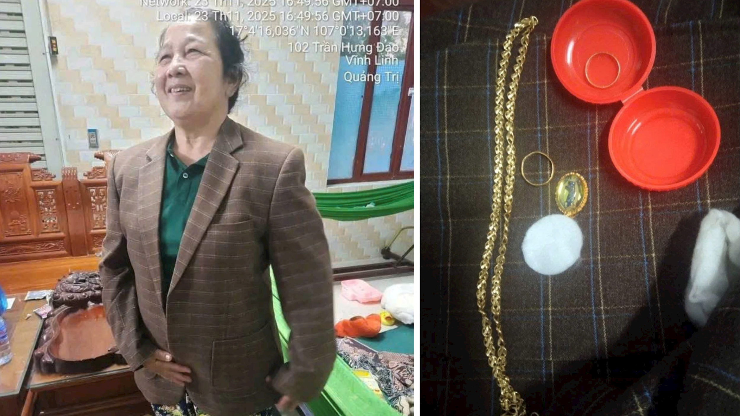 Theo đó, trong quá trình phân loại áo quần cũ do người dân ủng hộ để hỗ trợ bà con đồng bào vùng lũ lụt Nam Trung Bộ, bà Hoàng Thị Triều (67 tuổi), trú tại xã Vĩnh Linh, đã phát hiện số tài sản lớn bao gồm 1 hộp trang sức chứa 2 nhẫn tròn kim loại màu vàng, 1 dây chuyền kim loại và 1 mặt tượng đá bọc kim loại màu vàng.