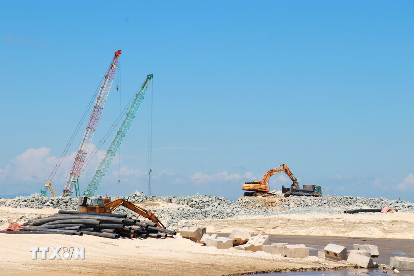 Phương tiện máy móc được huy động tối đa trên công trường dự án trọng điểm Khu bến cảng Mỹ Thủy. (Ảnh: Tường Vi/TTXVN)