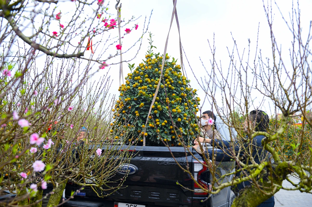 Các phương tiện vận chuyển hỗ trợ những gốc quất, đào, mai lớn giao tận nơi cho khách. Tất cả tạo nên nhịp điệu tất bật đặc trưng của những ngày cuối năm.