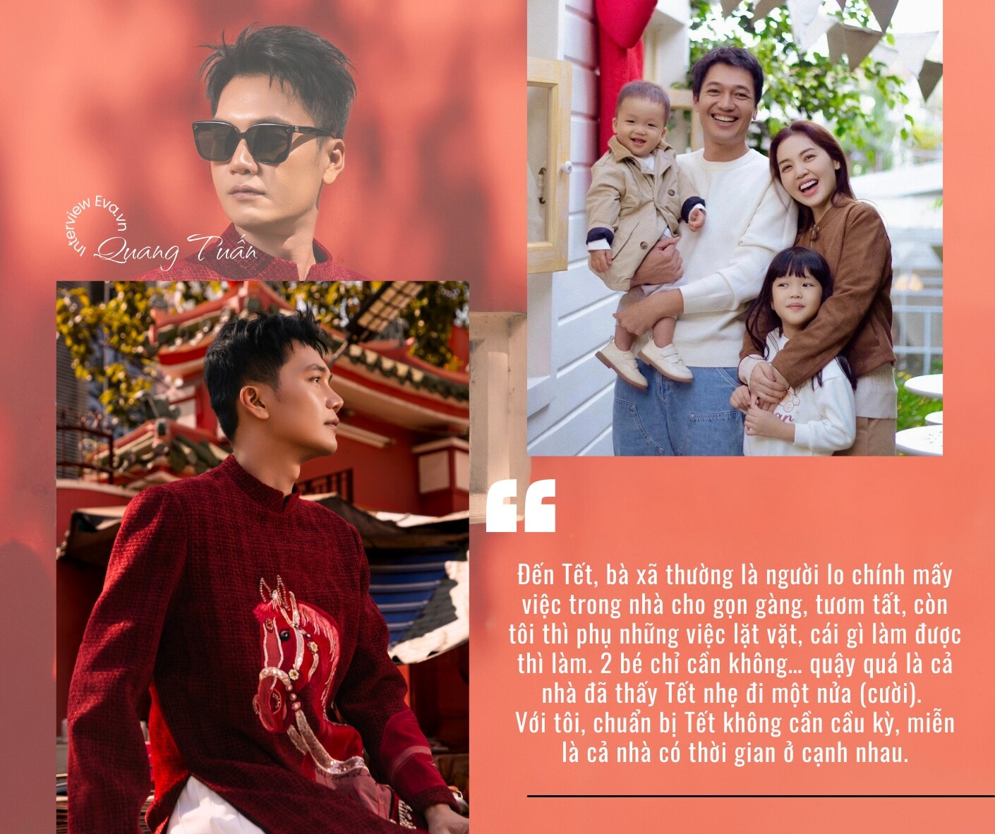 Tết năm nay, gia đình Quang Tuấn vẫn duy trì nếp sinh hoạt truyền thống với các hoạt động dọn dẹp và trang hoàng nhà cửa. Anh cho biết chuẩn bị Tết không cần quá cầu kỳ, quan trọng nhất là sự hiện diện của đầy đủ các thành viên. Nam diễn viên cũng sẽ góp mặt trong vở kịch mới tại sân khấu Thế Giới Trẻ vào dịp Tết Nguyên đán.