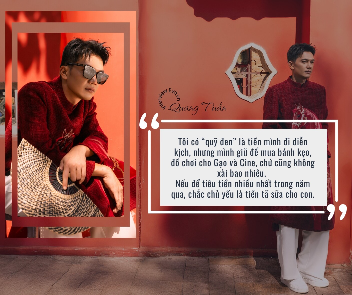 Dù gặt hái nhiều thành công về danh tiếng, Quang Tuấn khẳng định bà xã mới là người quản lý tài chính chính trong gia đình. Anh hóm hỉnh tiết lộ bản thân chỉ có một khoản "quỹ đen" nhỏ từ thù lao diễn kịch để mua bánh kẹo và đồ chơi cho hai con là Gạo và Cine. Phần lớn chi tiêu trong năm qua của anh đều tập trung vào việc chăm lo tã sữa cho các con.