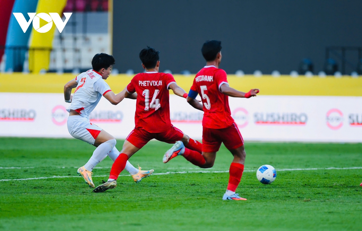 Khi đã loại bỏ 3 cầu thủ đối phương, Đình Bắc tung chân trái lên nhắm thẳng vào góc xa khung thành U22 Lào.