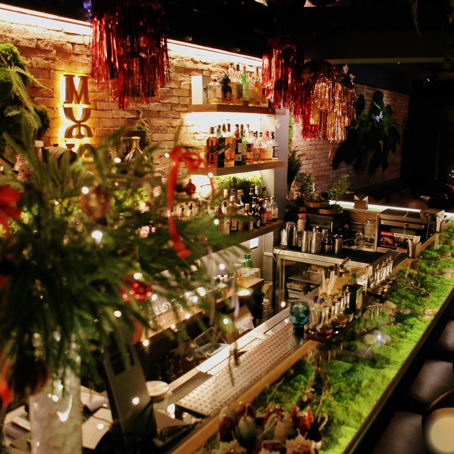 The Moss Bar trang trí theo phong cách terrarium với nhiều cây cỏ và quầy pha chế trong suốt, ẩn rêu xanh khác biệt. Quán nhỏ nhắn nhưng sang trọng, đủ "chill". Năm nay, không gian biến thành "ốc đảo Giáng sinh" tươi sáng, đúng tinh thần concept. Xen kẽ trong tán thông, hoa tuyết, quả châu là đèn vàng ấm áp, đèn đỏ lấp lánh để tăng không khí lễ hội, âm nhạc cũng không quá ồn ào.