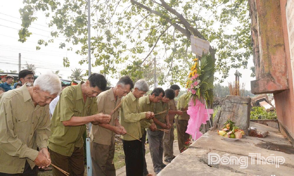 Cựu chiến binh thắp hương tại “Bia căm thù” ở ấp Hòa Mỹ, địa điểm ghi dấu sự kiện Mỹ, ngụy bắn chết 34 cán bộ, chiến sĩ và Nhân dân vào ngày 17-4-1961.