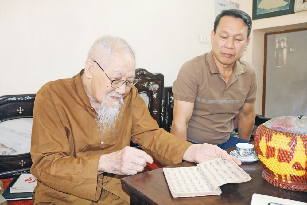 Cụ Trần Văn Bột, 97 tuổi ở thôn Kim Thiều, phường Phù Khê giới thiệu cuốn gia phả của dòng họ Trần.