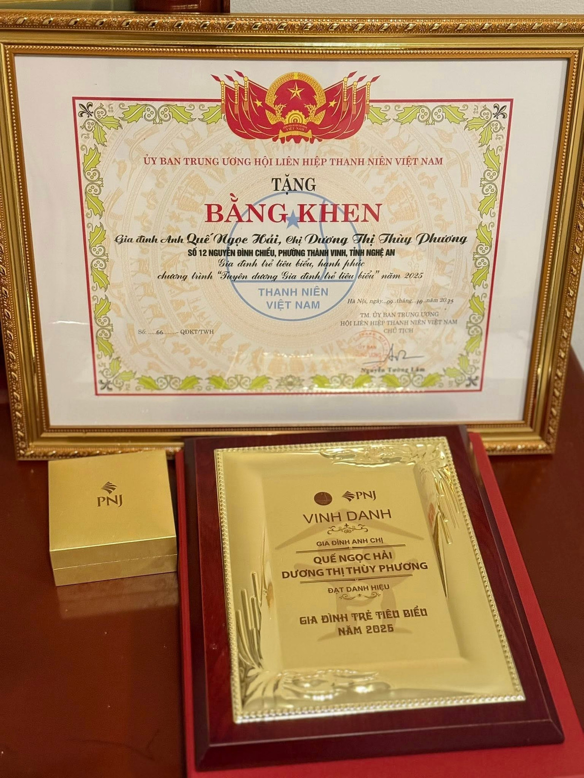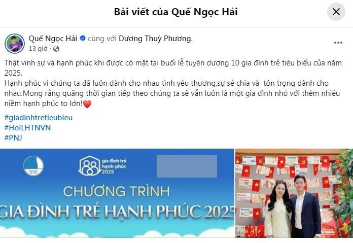 Việc vợ chồng Quế Ngọc Hải được tuyên dương là "Gia đình trẻ hạnh phúc" là sự ghi nhận xứng đáng cho những nỗ lực vun đắp, sẻ chia và trách nhiệm của cặp đôi trong việc xây dựng một tổ ấm bền vững, lan tỏa những giá trị tích cực đến cộng đồng. (Ảnh: FB Quế Ngọc Hải)