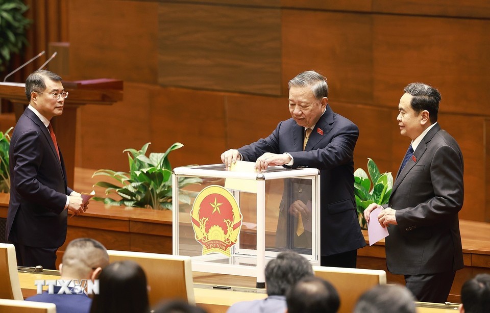 Tổng Bí thư, Chủ tịch nước Tô Lâm và các đại biểu Quốc hội bỏ phiếu bầu Thủ tướng Chính phủ. Ảnh Dương Giang/TTXVN