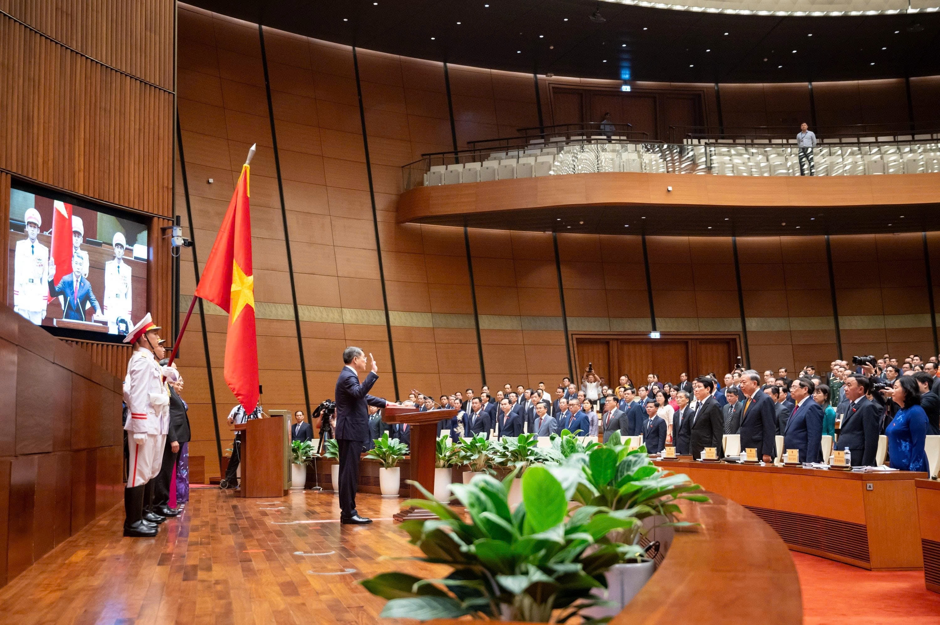 Dưới cờ đỏ sao vàng thiêng liêng của Tổ quốc, trước Quốc hội và đồng bào, cử tri cả nước, Thủ tướng Chính phủ Lê Minh Hưng tuyên thệ: “Tuyệt đối trung thành với Tổ quốc, với nhân dân, với Hiến pháp nước Cộng hòa xã hội chủ nghĩa Việt Nam, nỗ lực phấn đấu hoàn thành tốt nhiệm vụ được Đảng, Nhà nước, nhân dân giao phó".