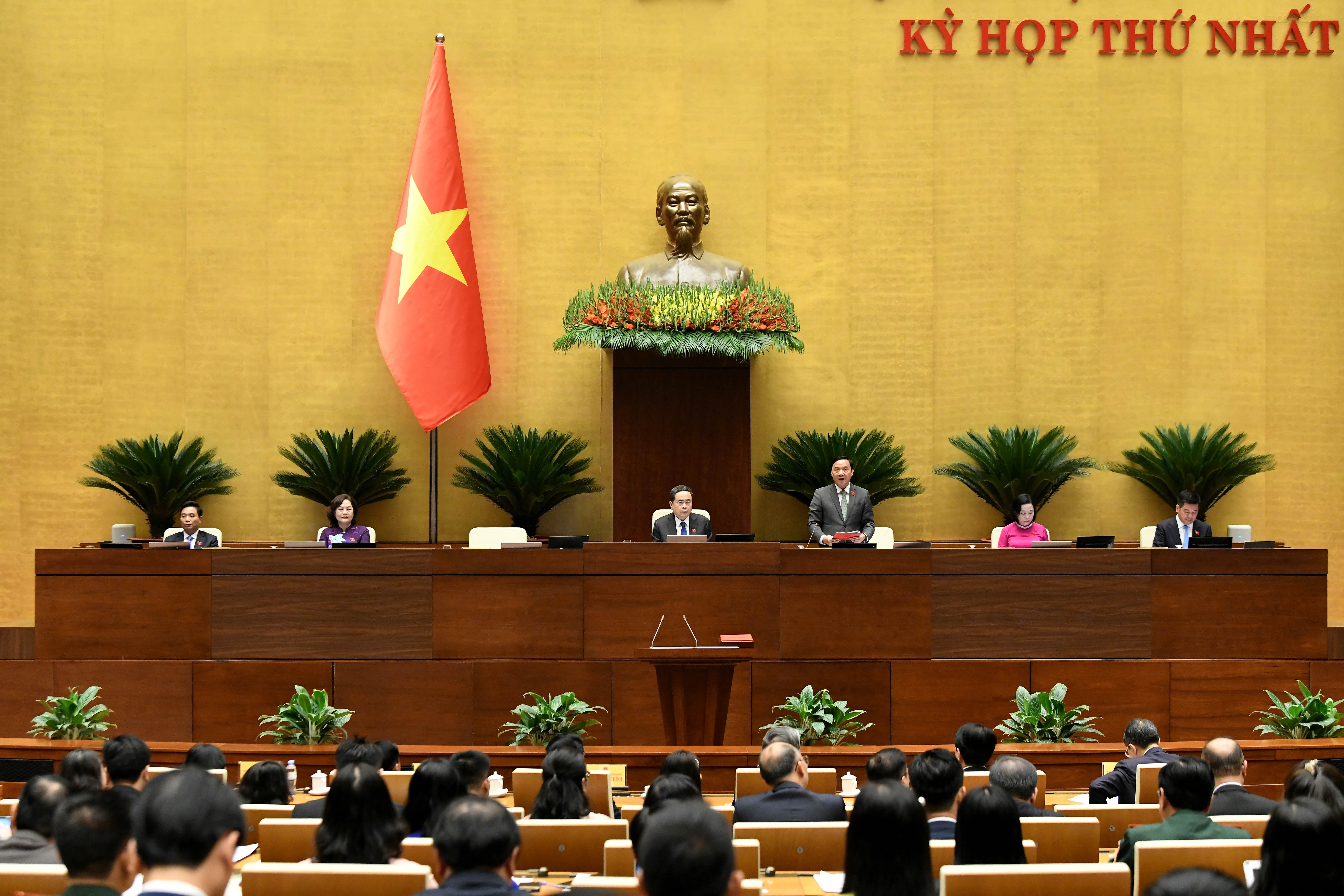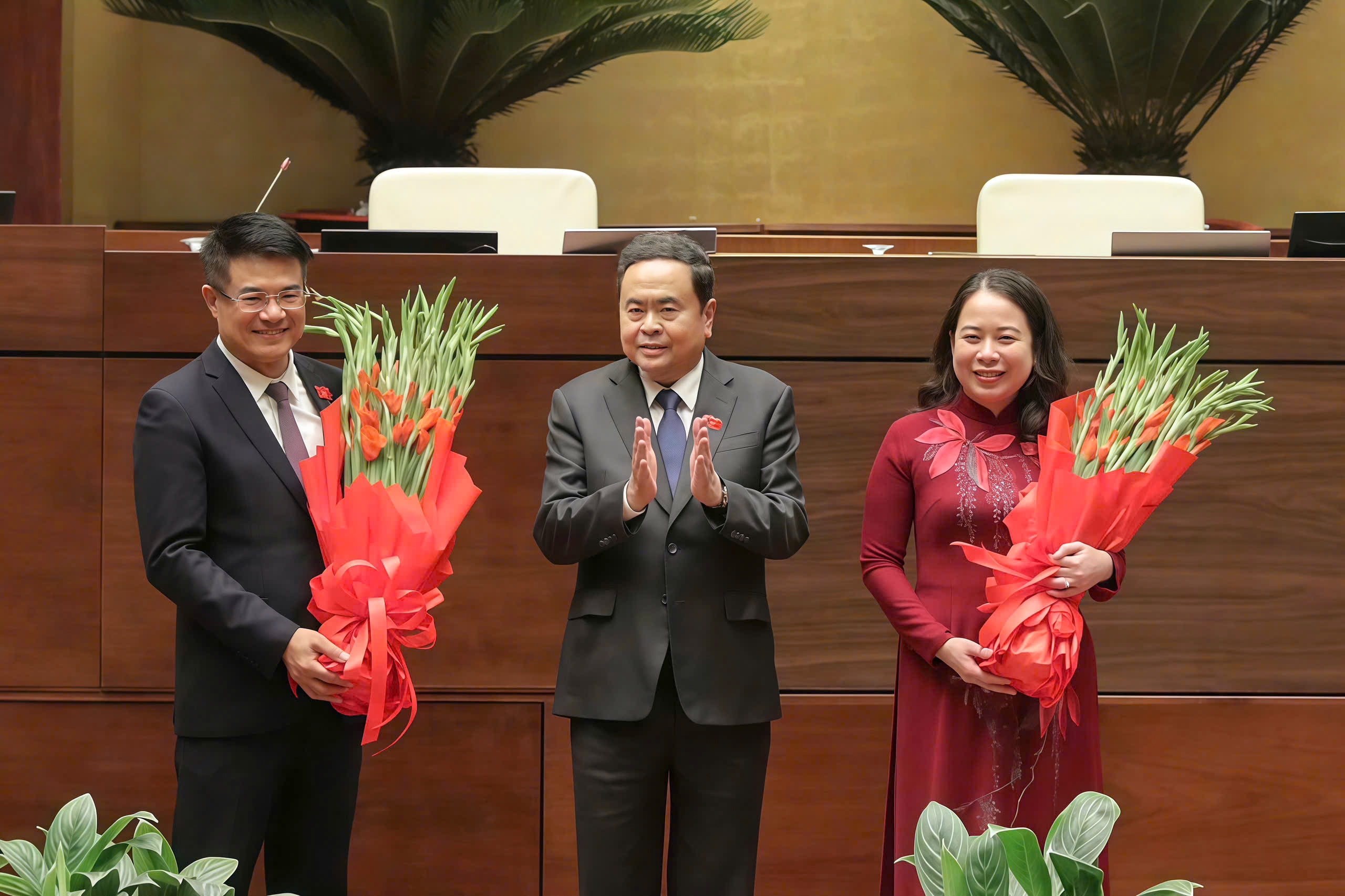 Chủ tịch Quốc hội Trần Thanh Mẫn tặng hoa chúc mừng Phó Chủ tịch nước Võ Thị Ánh Xuân và Viện trưởng Viện Kiểm sát nhân dân tối cao Nguyễn Huy Tiến. Ảnh: Hồ Long