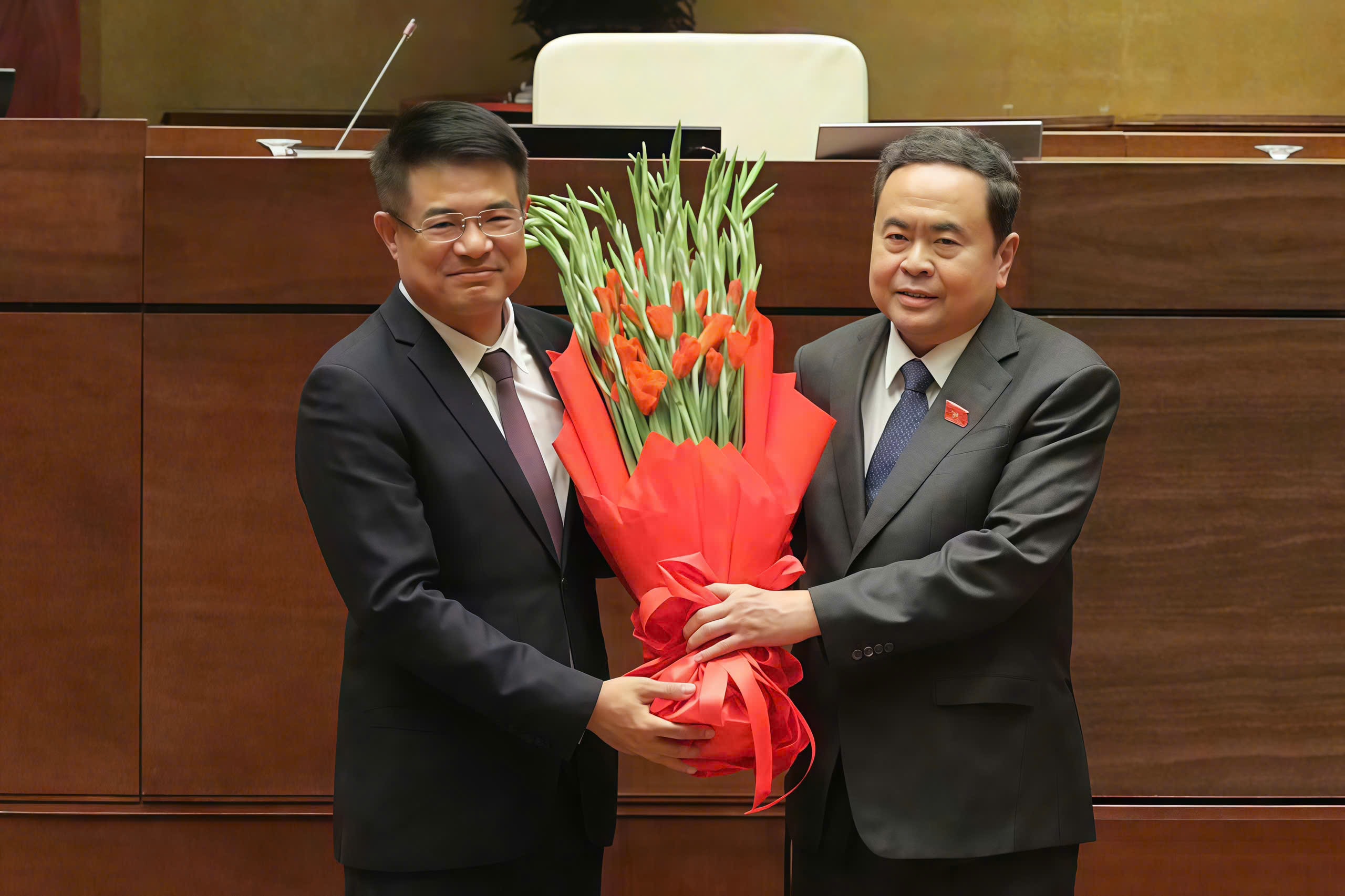 Tiếp đó, Chủ tịch Quốc hội Trần Thanh Mẫn đã thay mặt Lãnh đạo Đảng, Nhà nước và các ĐBQH khóa XVI tặng hoa chúc mừng Phó Chủ tịch nước nhiệm kỳ 2026 – 2031 Võ Thị Ánh Xuân và Viện trưởng Viện Kiểm sát Nhân dân tối cao nhiệm kỳ 2026 – 2031 Nguyễn Huy Tiến.